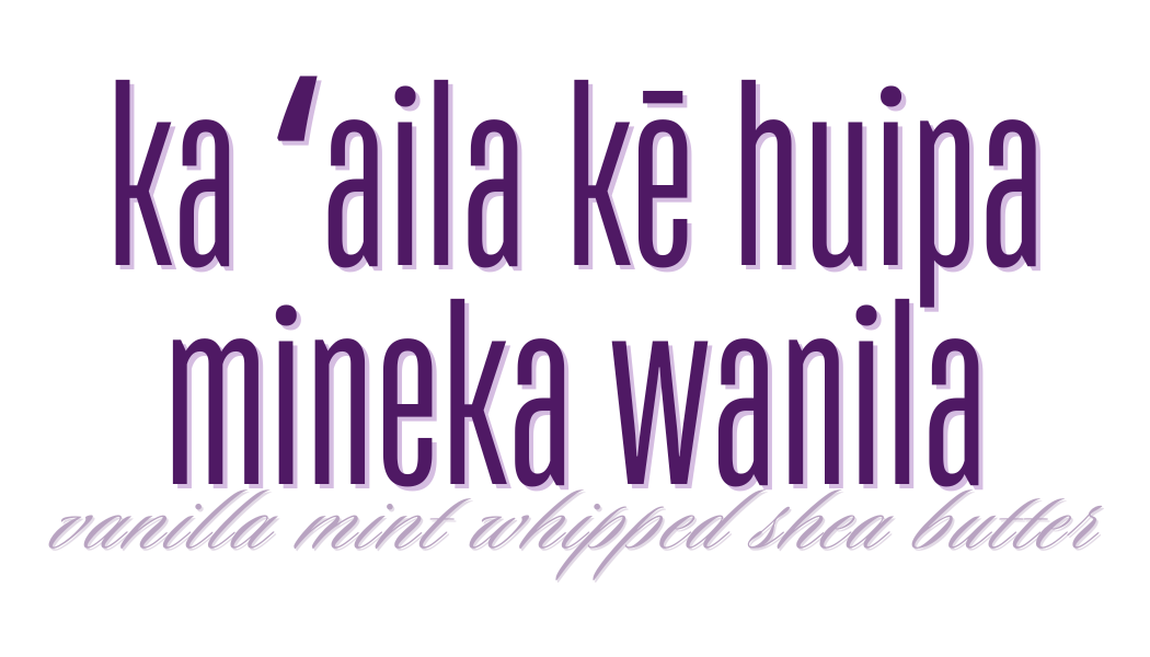 Text in large purple font says "ka'aila ke huipa mineka vanilla". Below in smaller purple cursive font, it says "vanilla meat whipped show butter".